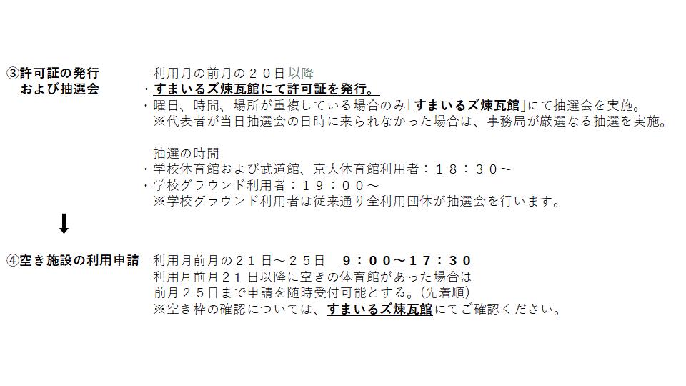 利用申請の結果、希望枠が重なった場合のみ抽選を行い、翌月分の利用団体を決定します。