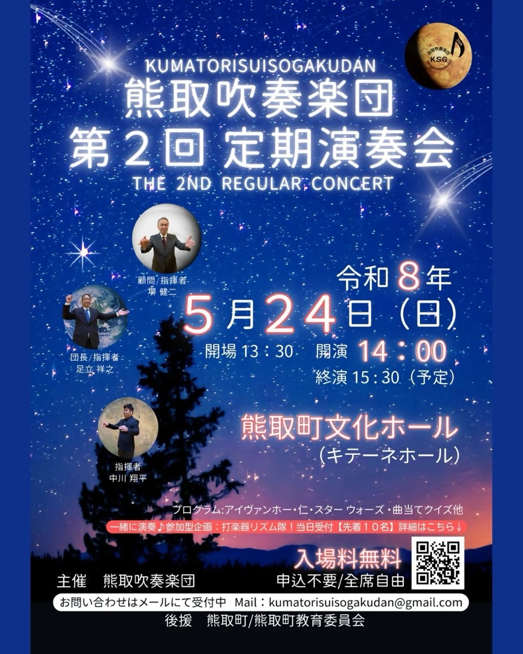 星空を音楽で旅してみませんか。熊取吹奏楽団の第2回定期演奏会は、「星」をテーマにした吹奏楽の名曲を集め、子どもから大人まで楽しめる演奏会をお届けします。
